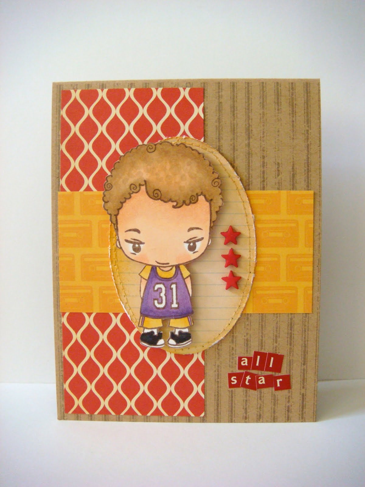 And here's my card. I used new Sprout Ethan and papers from Cosmo Cricket. I stamped him in brown ink and used LA Lakers' colors for his jersey. Go Lakers!