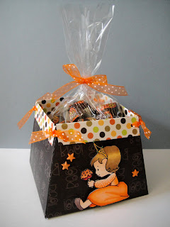 Happy Monday! Today is the much anticipated release of Amy's cute Halloween kiddos--Sweet November Baby Tricks or Treats--at All That Scraps! I colored two more of her adorable images, trimmed them out and attached them to a trapezoid box made with My Mind's Eye papers.