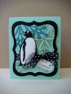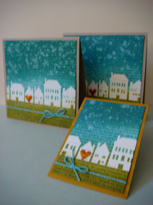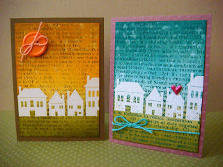 The 2010 catalog will feature some house stamps and this row of houses stamp has a lot of possibilities--new home, a move, housewarming. After embossing the houses, I ink distressed and water splotched the "sky", then stamped over the entire card with the Friend definition stamp. I trimmed the image to make a smaller card and added a puffy heart sticker for dimension.
