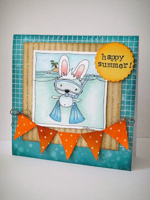 The piece behind the bunny was stamped with Large Canvas Stripes in Frayed Burlap and ink distressed with the same color. The sentiment was handstamped by me, using my favorite $1 alpha stamps and I added a touch of Glossy Accents to the bunny's snorkel mask.