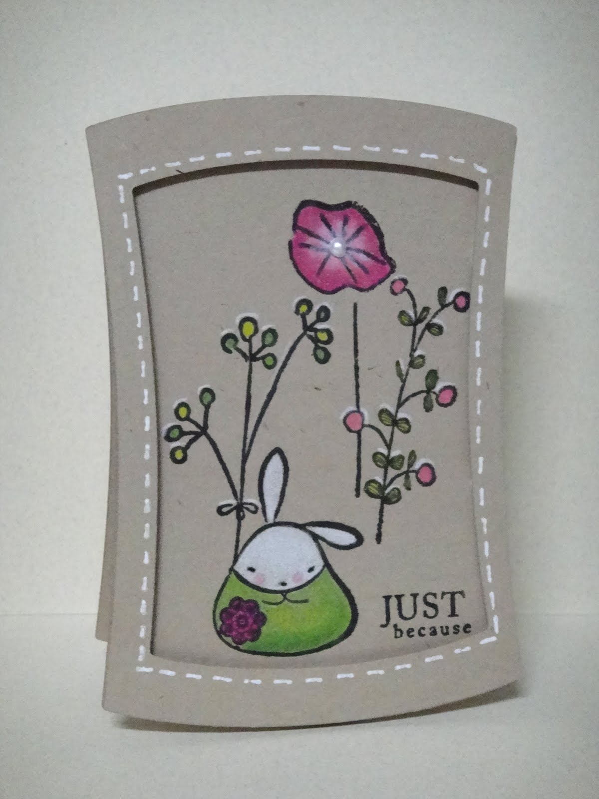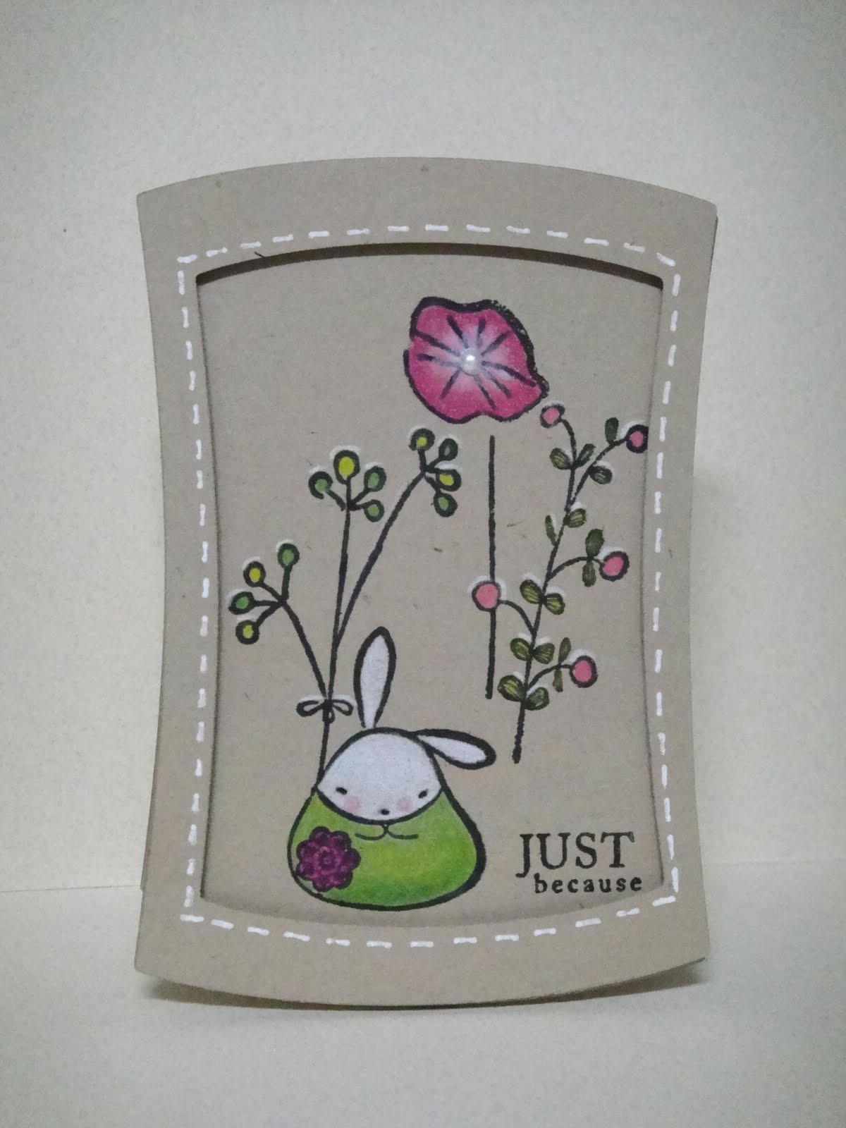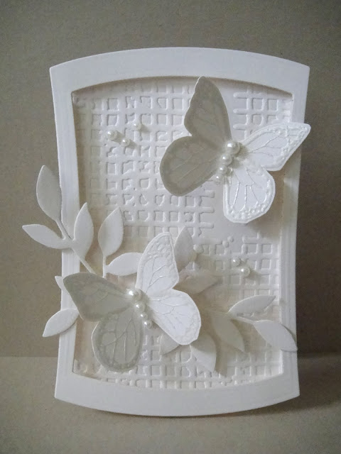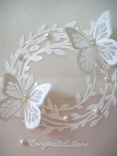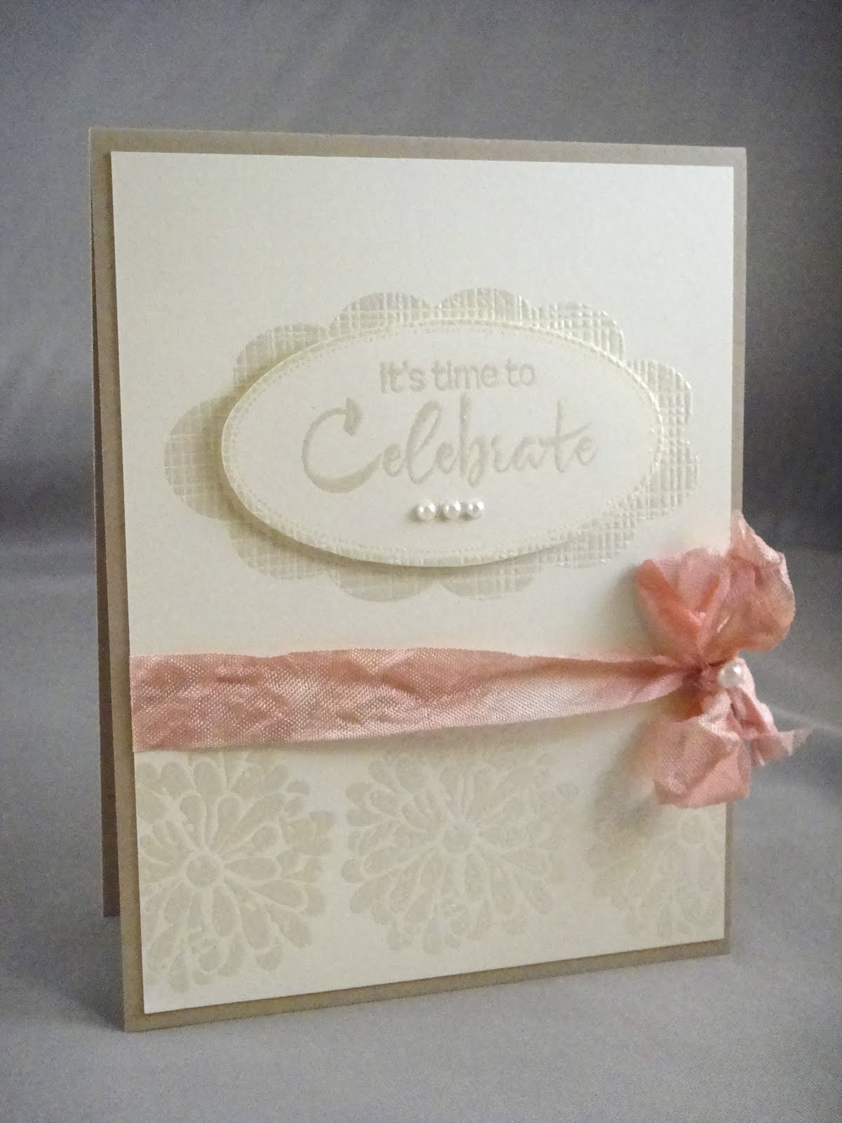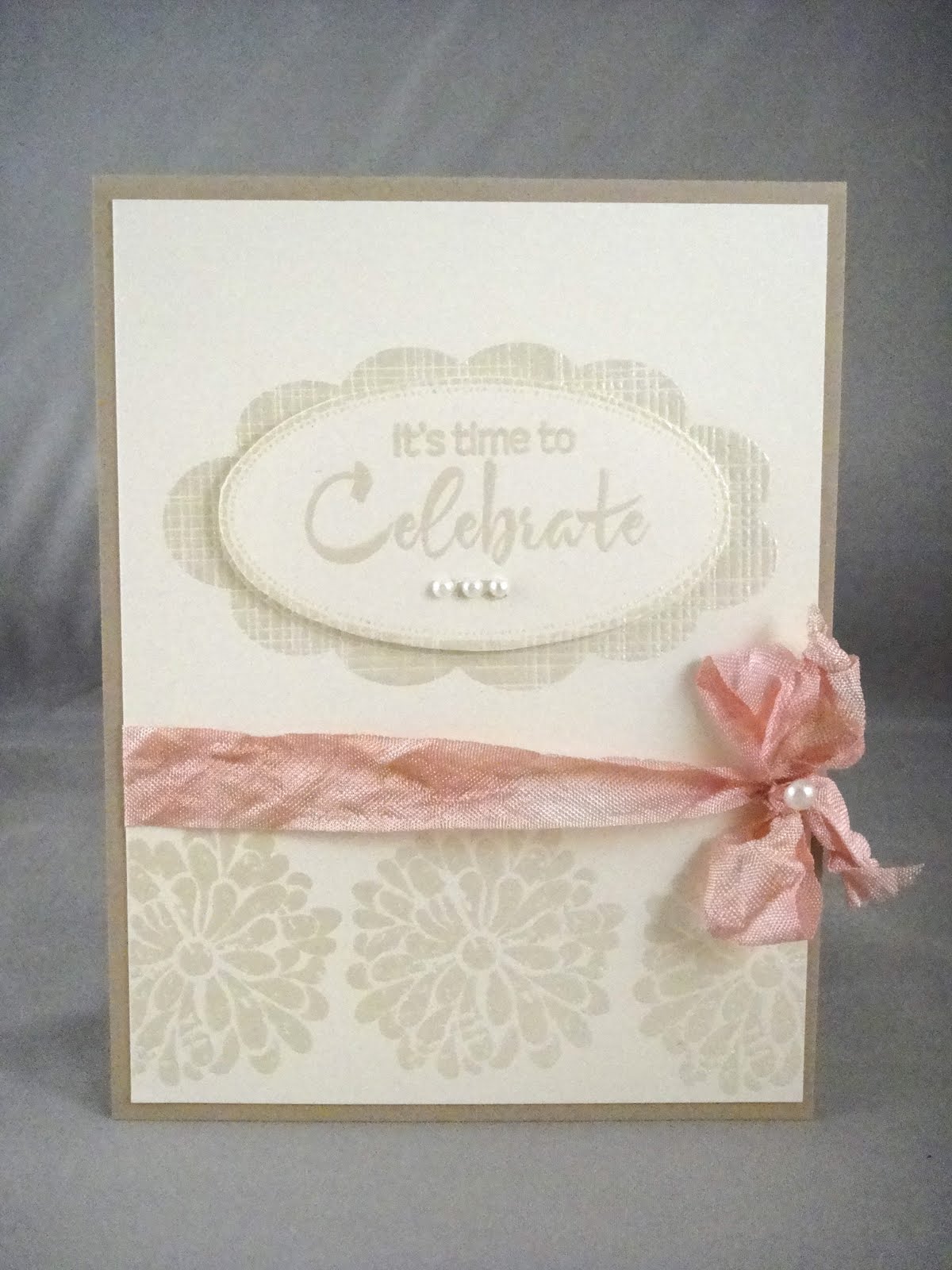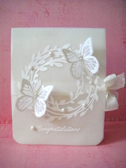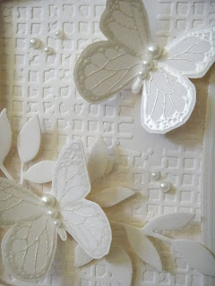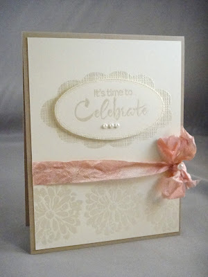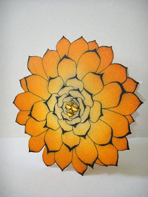 The dress form was stamped on some Basic Grey papers. I also used Martha Stewart's hydrangea border punch and placed an orange gemstone on the dress form. The sentiment was embossed with white detail powder.