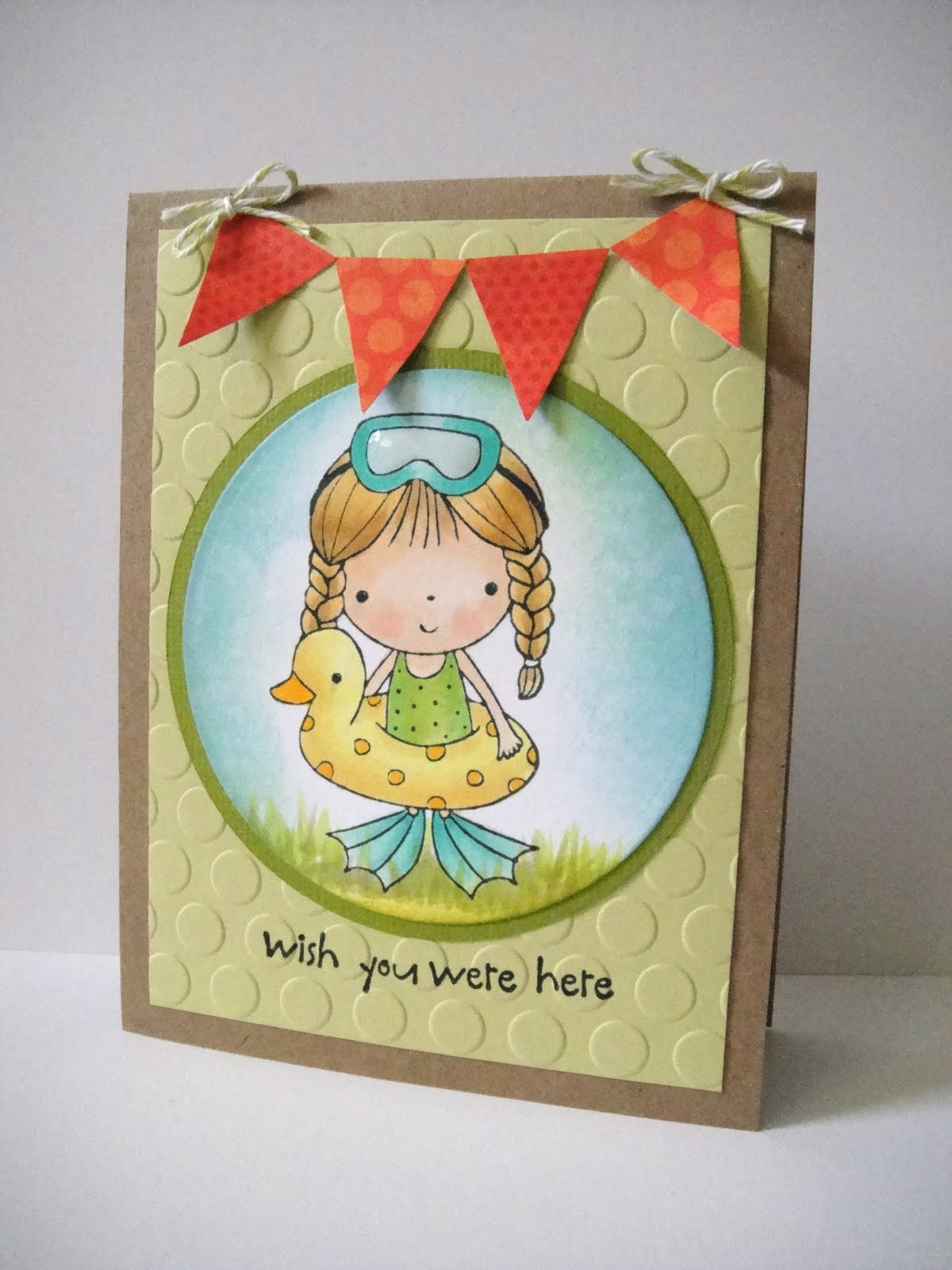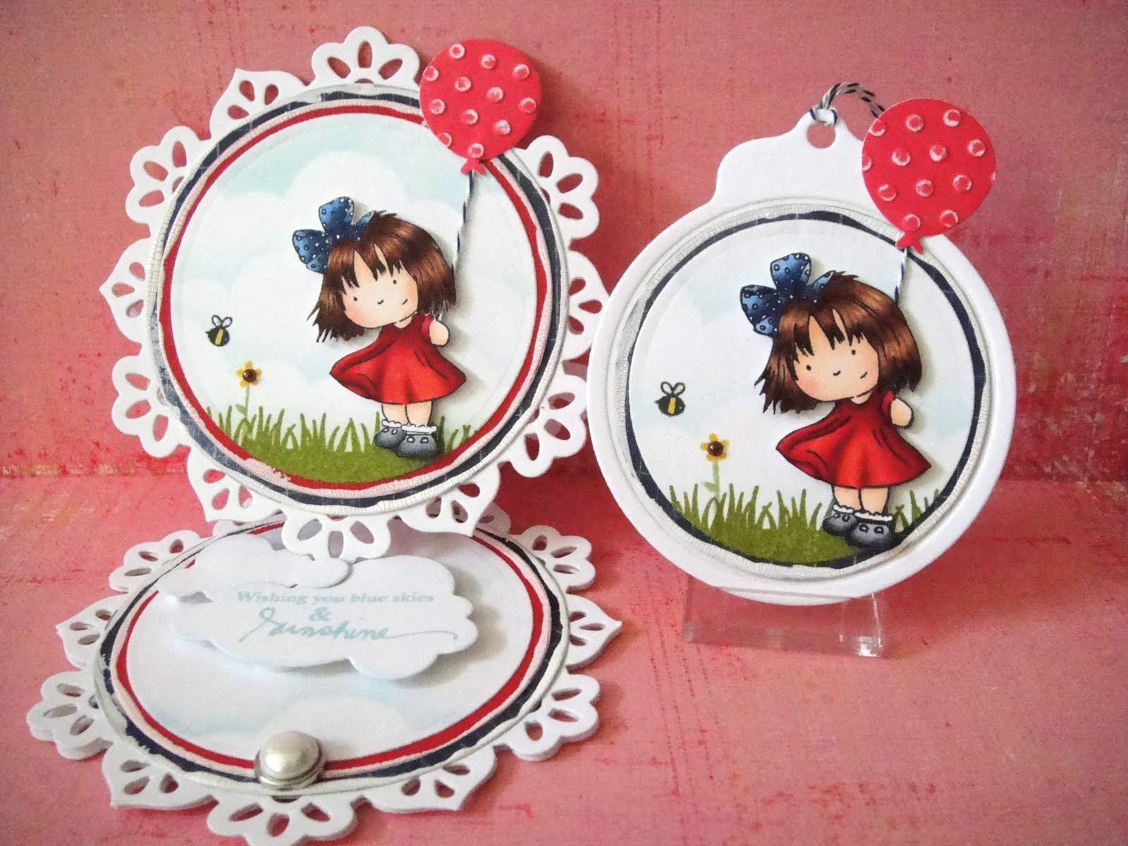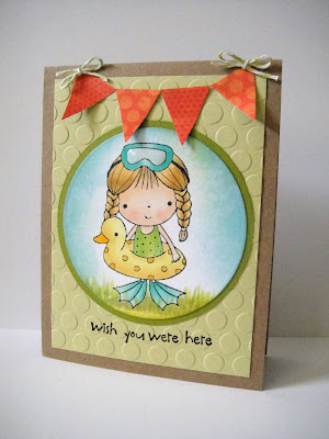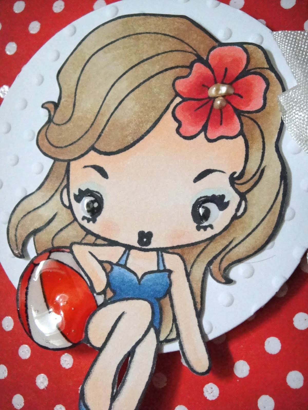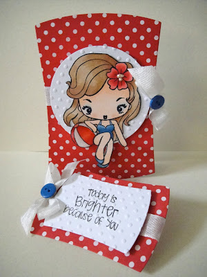 I added Glossy Accents to her beach ball and her eyes, and a bit of Liquid Pearls to the center of the flower. The sentiment on the tag is from The Greeting Farm, and some white seam binding and a blue button finished them off.