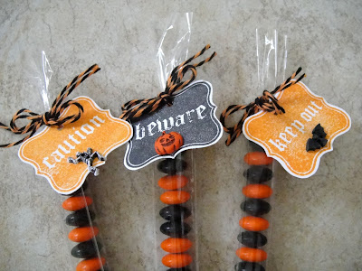 I used the Caution Labels set and stamped them in Spiced Marmalade and Black Soot distress inks. I love the distressed look of the labels so you don't have to be concerned with a clear, crisp image. After cutting them out, I added some Halloween buttons for a bit of fun.