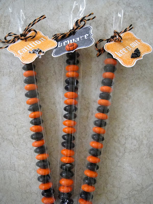 I filled some skinny cello bags with black and orange M&Ms, tied them off with some black and orange twine that I found here on Etsy (thanks for the heads up, Torico!) and tied the labels on. Done! I'm planning to assemble a bunch of these for my daughter's first graders for Halloween.