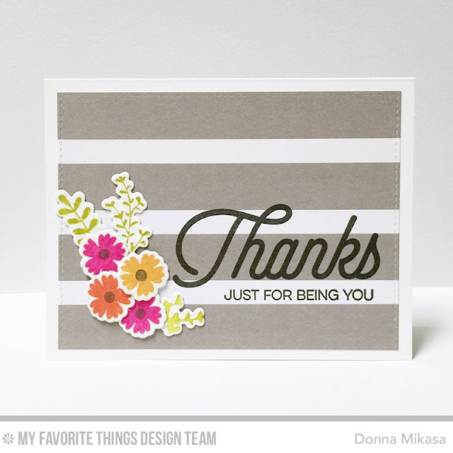 sentiment was stamped with Black Licorice ink, using the stripes as a guide. Flowers and