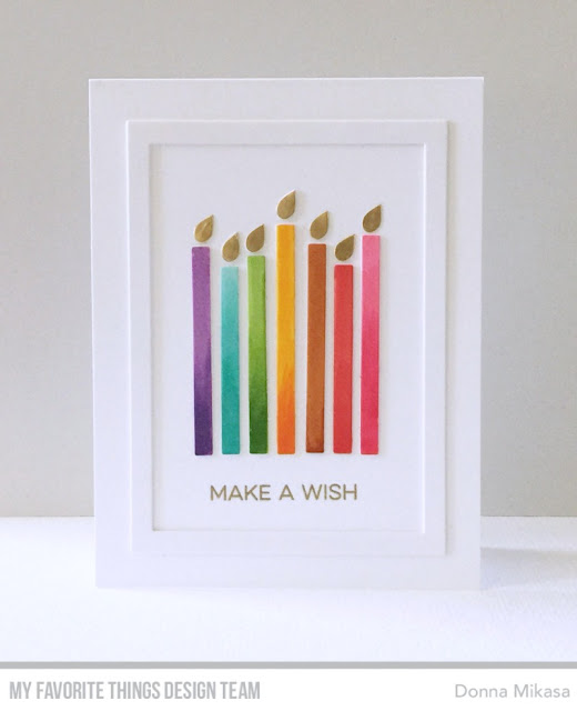 1. Pretty rainbow colored candles with shiny gold flames, Donna. The card receiver is making a wish and blowing candles, right? The simple white-on-white frame finishes off the card perfectly. Love the ombre Copic coloring!