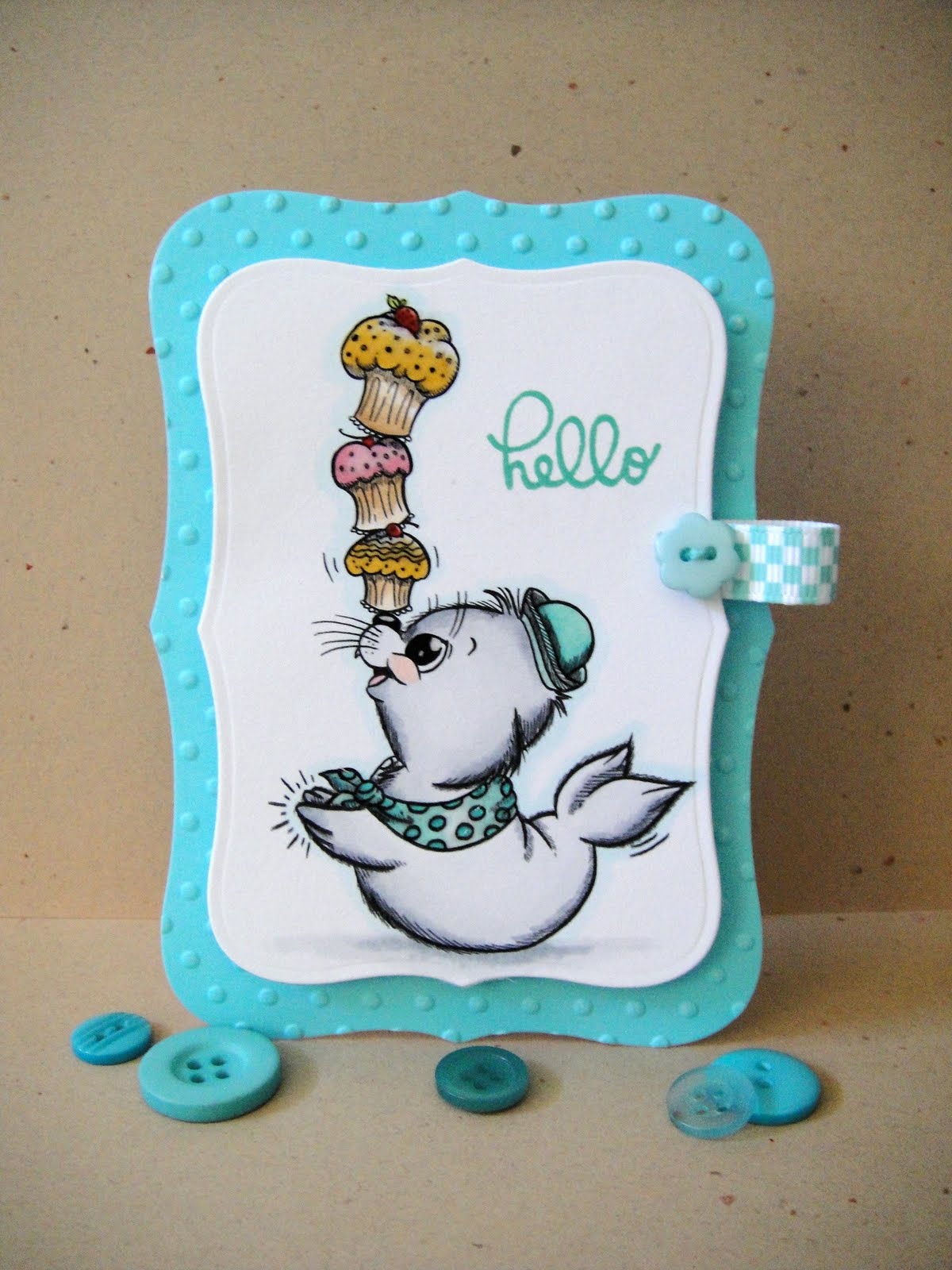 For my card for Grace, I used Robbie Seal, a new Greeting Farm digi which made me smile as soon as I saw it and I hope that Grace will, too. Love those stacked cupcakes! Yum!