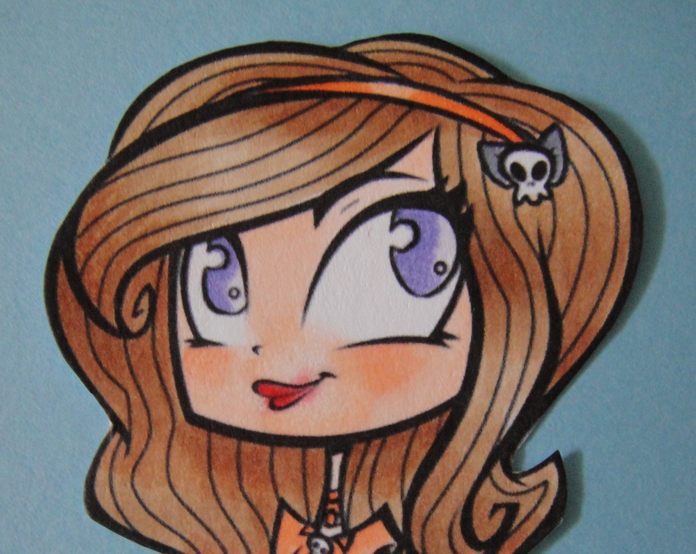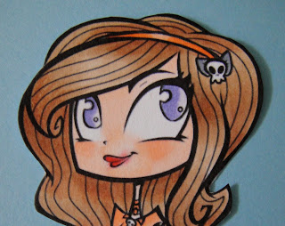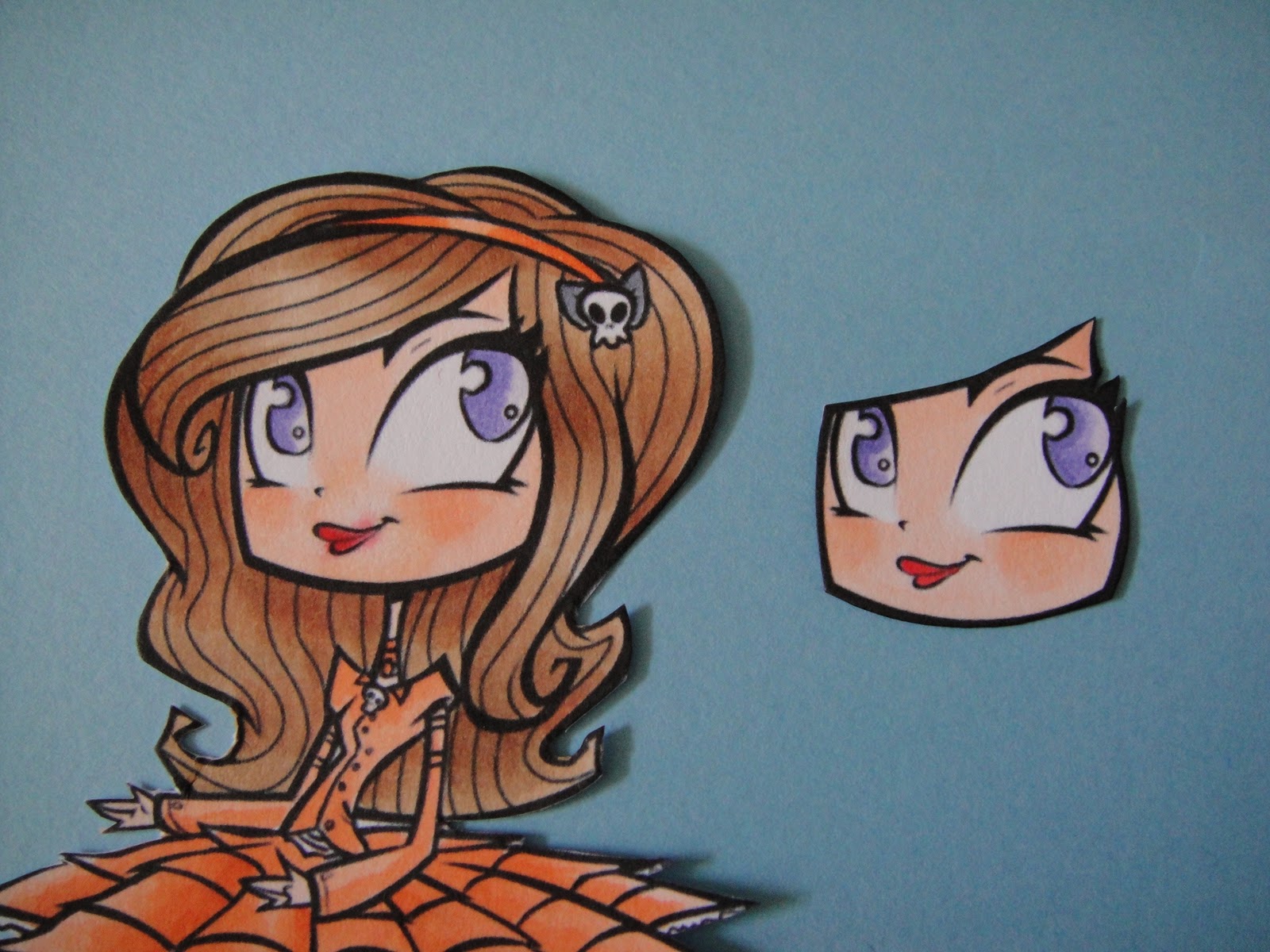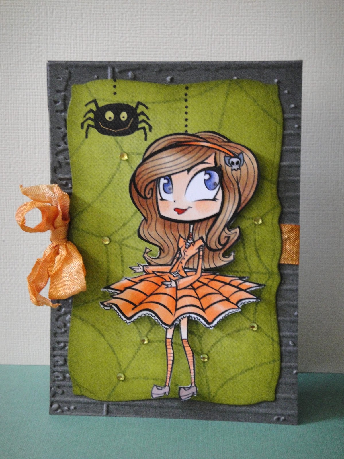 I chose "Rio", a digital stamp from Simply Betty who will be retired as a digi this Halloween (how appropriate!) and turned into rubber. I've always admired her super cool spider web skirt!