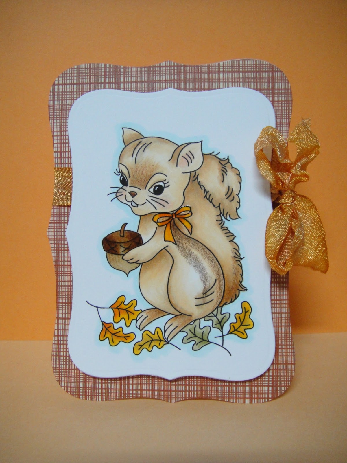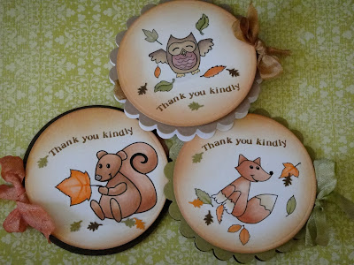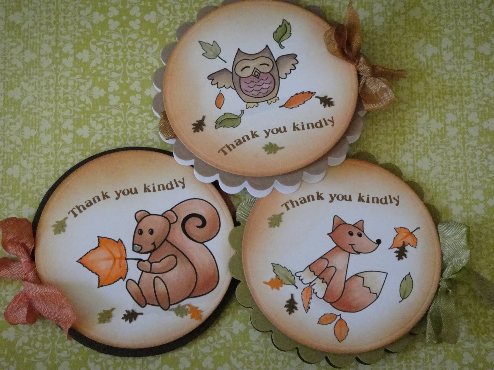 I used Fall Critters, a set of 4 adorable images on sale here. I decided to make a set of thank you notecards and simply printed the digis, colored them, and added a few more punched leaves. The sentiment is one of my favorites from Impress. I also tied each of them with some hand dyed crinkled ribbon to match.