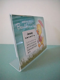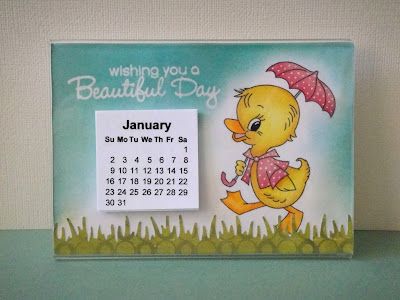 Here's my project using one of Tiffany's newest images--Ducky Umbrella. I made a desk calendar using an acrylic photo frame. After coloring the image, I stamped and embossed the sentiment and sponged around the edges to make the sentiment pop.